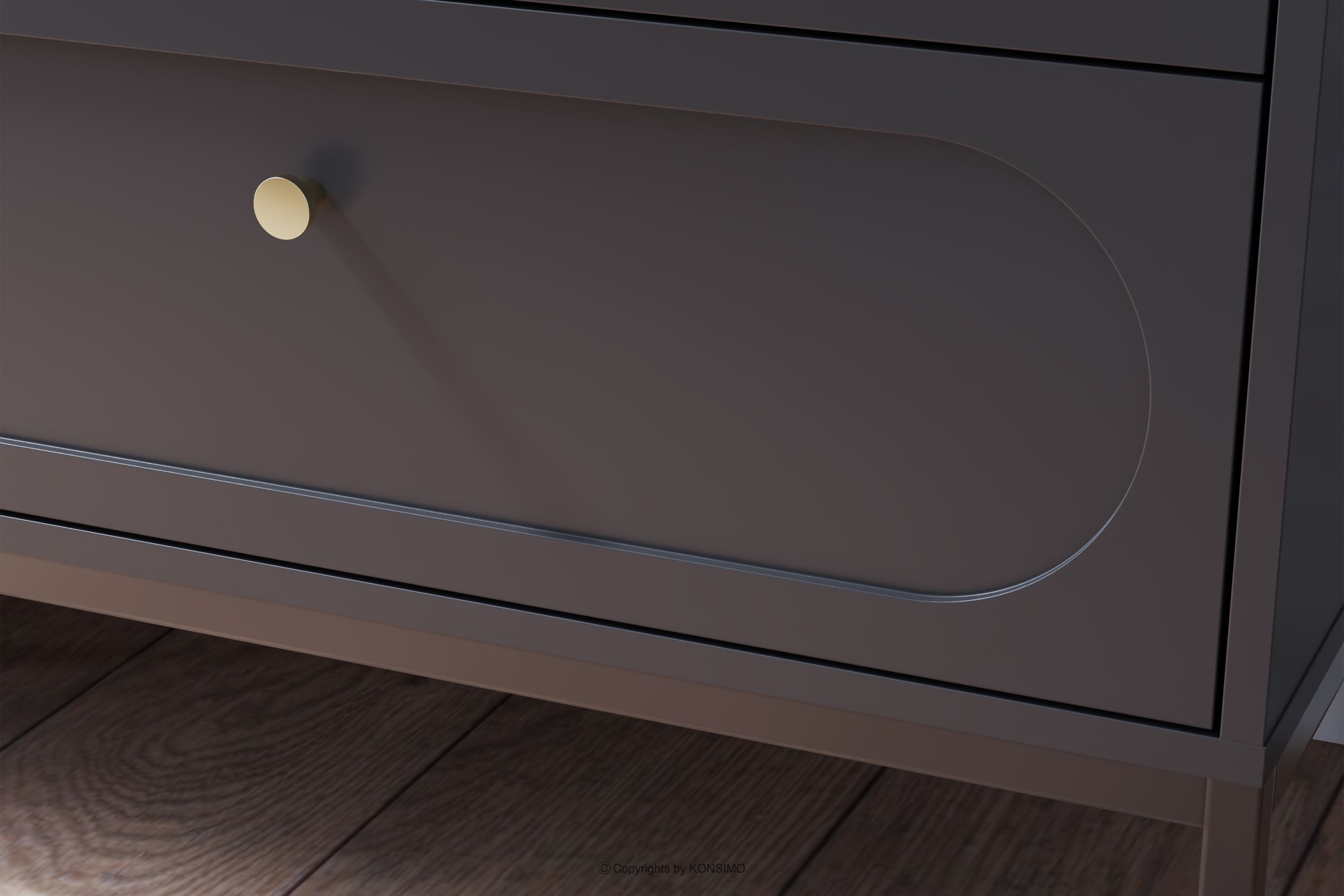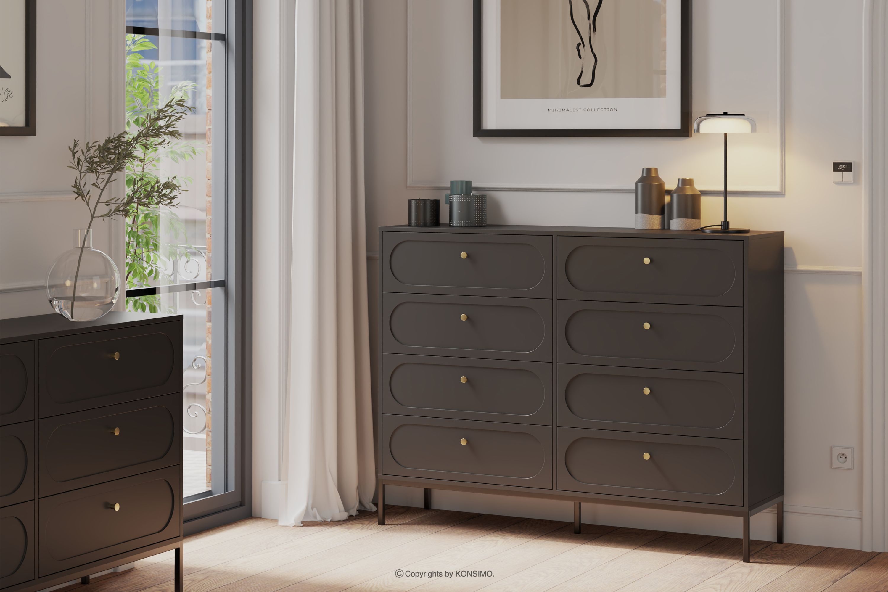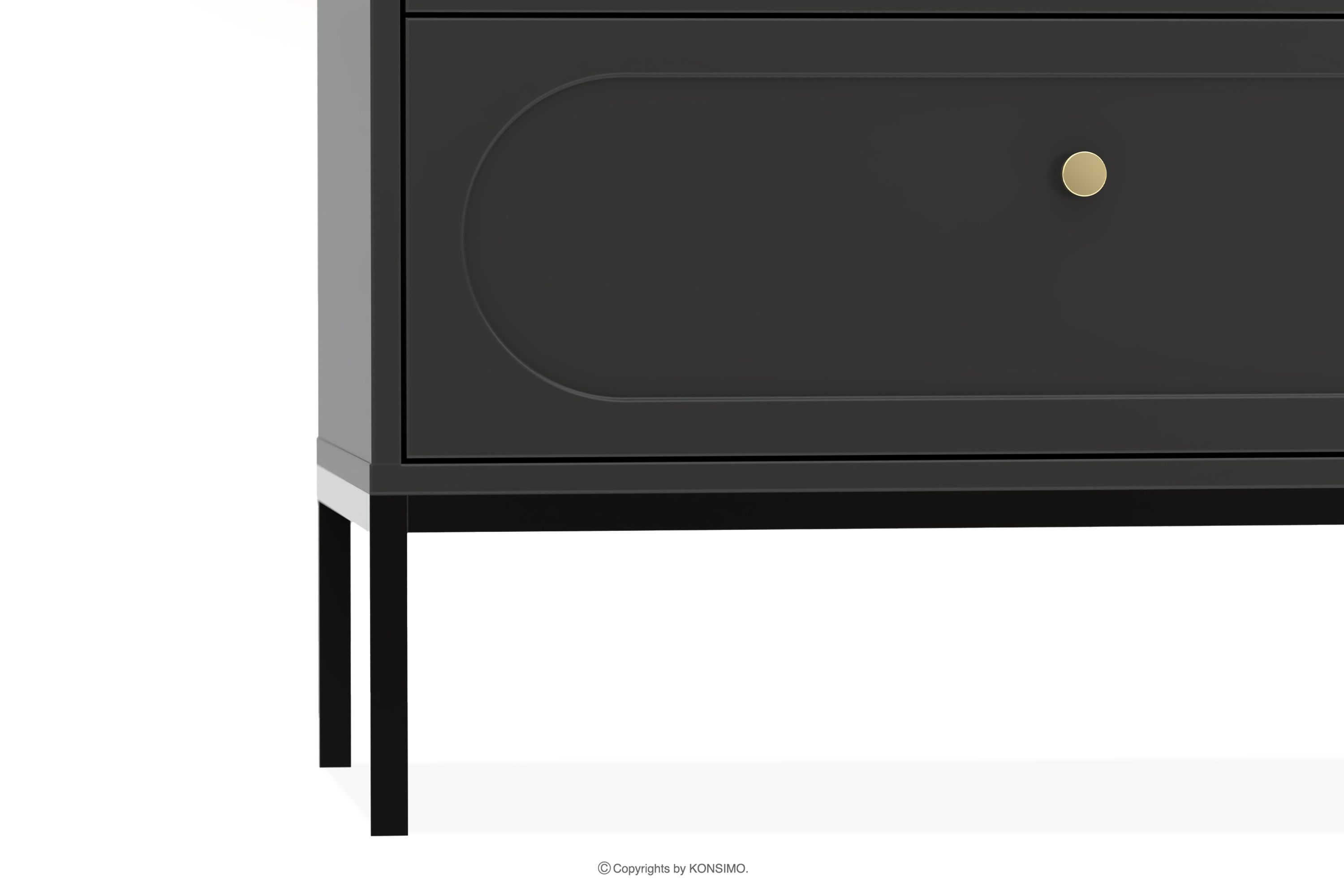 Komoda s čiernymi nožičkami je kvintesenciou moderného dizajnu, ktorý harmonicky spája funkčnosť s rafinovanou estetikou. Čierna farba vnáša do interiéru nádych modernosti a elegancie a zároveň poskytuje univerzálnosť, vďaka ktorej sa môže voľne kombinovať s rôznymi dizajnovými štýlmi. Čelá vyrobené z 18 mm MDF s dokonale hladkým povrchom vytvárajú minimalistickú formu s jemným zdobením, ktoré poskytuje dokonalé pozadie pre starostlivo vybrané čierne úchyty.