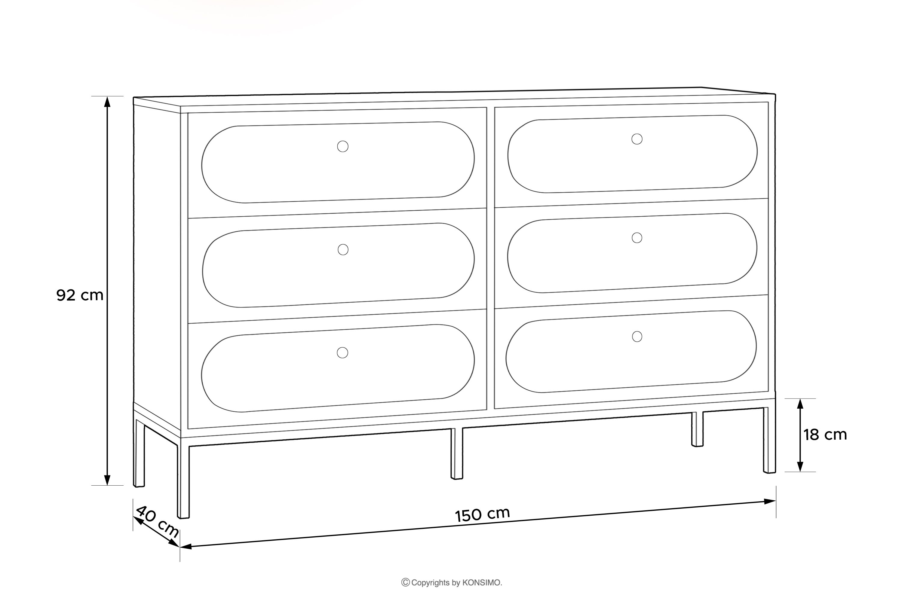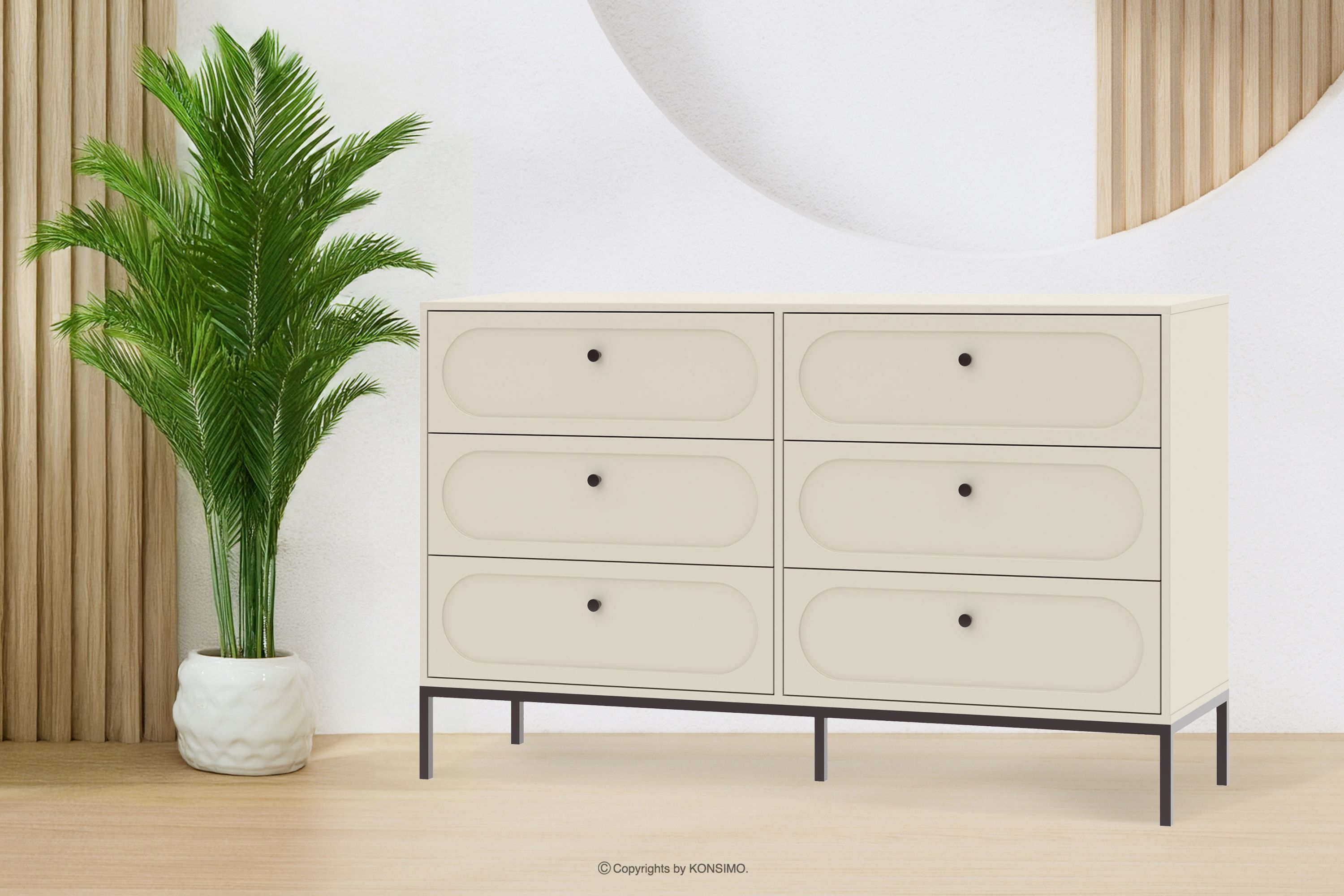 Široká komoda krémovej farby na nožičkách je kvintesenciou moderného dizajnu, ktorý harmonicky spája funkčnosť s rafinovanou estetikou. Jemná béžová farebnosť vnáša do interiéru nádych modernosti a elegancie a zároveň poskytuje všestrannosť, vďaka ktorej sa môže voľne kombinovať s rôznymi dizajnovými štýlmi. Čelá vyrobené z 18 mm MDF s dokonale hladkým povrchom vytvárajú minimalistickú formu s jemným ornamentom, ktorý poskytuje dokonalé pozadie pre starostlivo vybrané čierne úchytky.