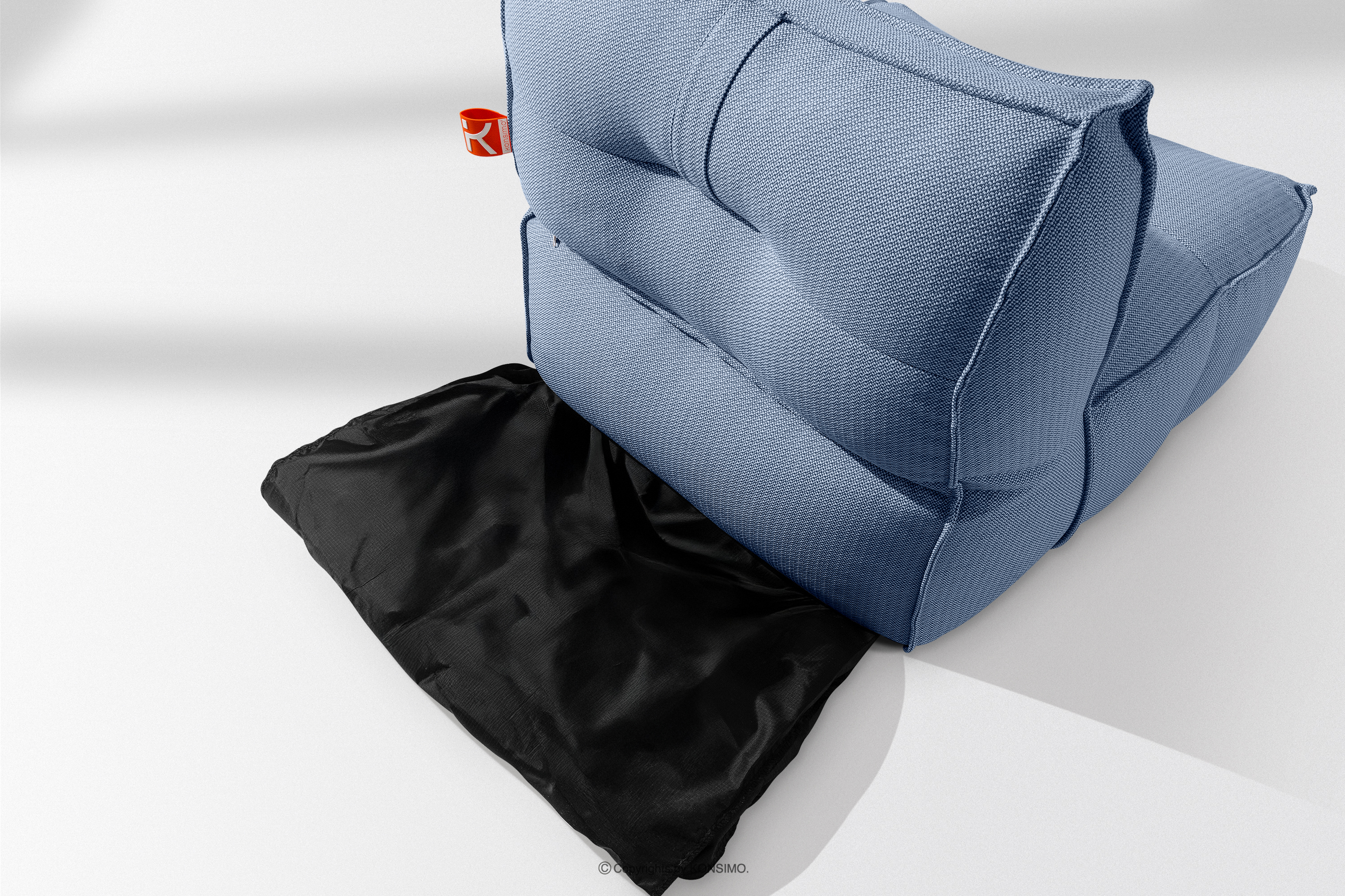 - Dodatočné informácie: spodná časť nábytku z protišmykovej tkaniny, uchopovací pás z čalúnenia pre ľahšie prenášanie, vonkajší poťah z nepremokavého materiálu všitý do konštrukcie nábytku, skrytý vo vnútri a uzatvárateľný na zips, všitá gumička v obale zabraňuje skĺznutiu z nábytku