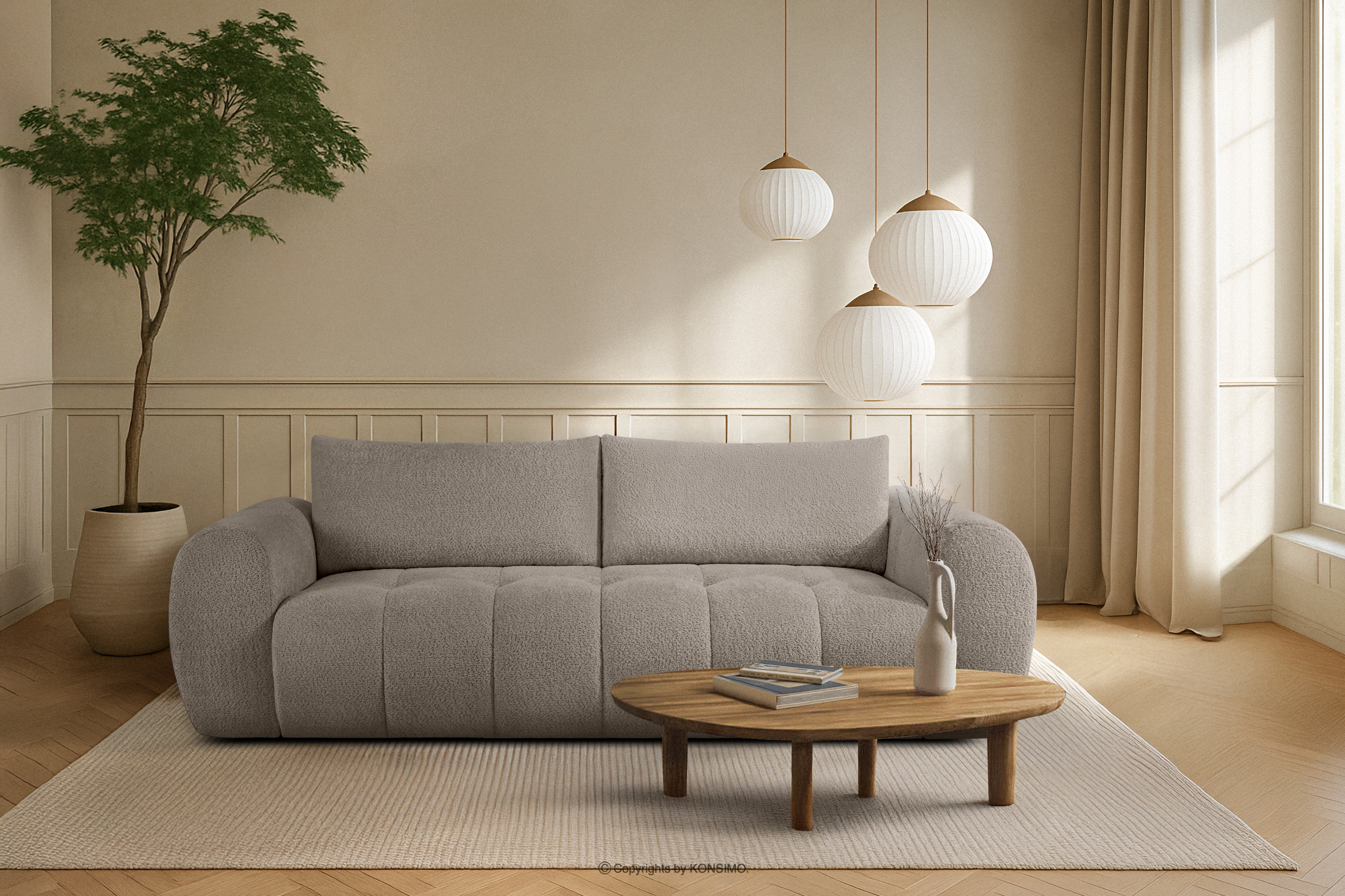 Estetika je založená na populárnom štýle japandi, ktorý je harmonickým spojením škandinávskeho minimalizmu a japonskej elegancie. Tento štýl sa vyznačuje jednoduchosťou, funkčnosťou a blízkosťou k prírode, čím vytvára interiéry plné pokoja a rovnováhy. Naša pohovka je čalúnená luxusnou látkou boucle, ktorá jej dodáva jedinečné čaro a textúru. Boucle tkanina, známa svojou mäkkosťou a príjemným povrchom, vnáša do interiéru prvok luxusu a útulnosti. Jej jedinečná štruktúra vytvára jemné vzory, ktoré krásne ladia s prirodzeným svetlom a dodávajú nábytku hĺbku a charakter. Vankúše operadiel sú vyplnené silikónovými guličkami, ktoré poskytujú dokonalú oporu chrbtici. Silikónové guličky sú materiál s vysokou pružnosťou a odolnosťou proti deformácii, vďaka čomu vankúše si zachovávajú svoju nadýchanosť a tvar po dlhú dobu a ponúkajú neporovnateľný komfort používania. Tieto detaily zdôrazňujú starostlivosť o každý aspekt dizajnu a vytvárajú nábytok, ktorý je nielen krásny, ale aj mimoriadne funkčný, ideálny na každodennú relaxáciu a odpočinok.
