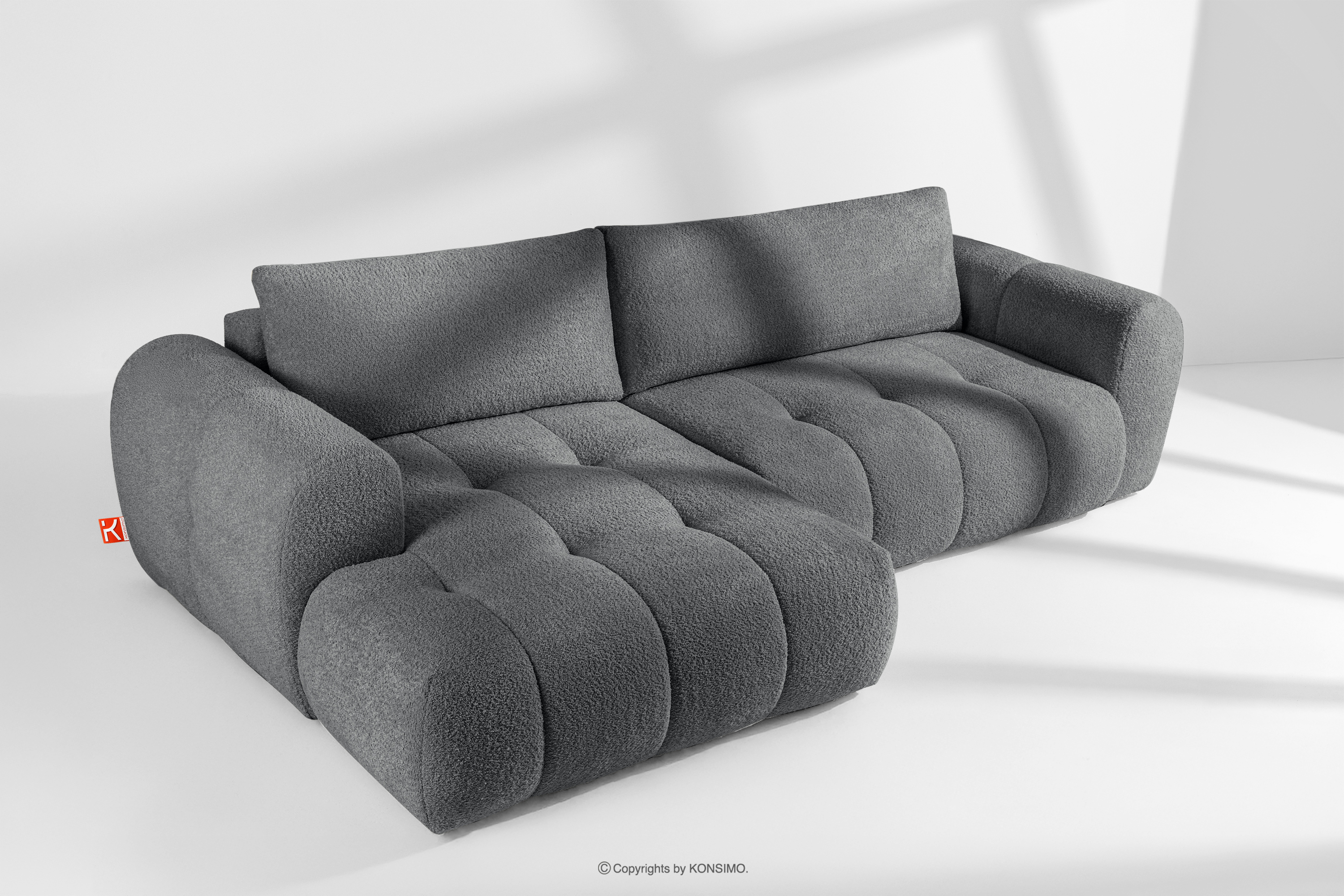 LIRA Objav celú kolekciu Rohová sedacia súprava v japandi štýle boucle tmavosivá vľavo- farba tmavošedá