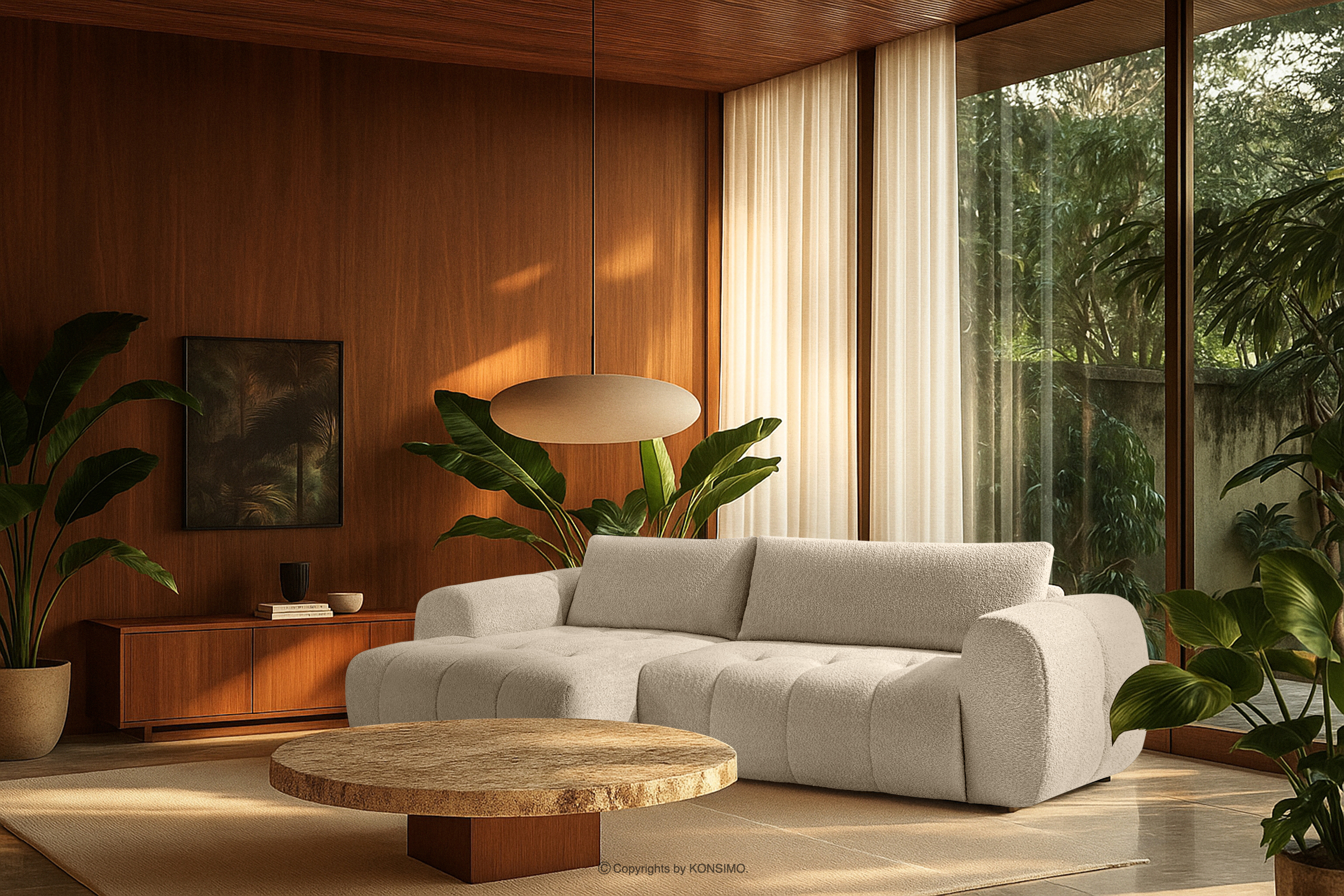 Rohová pohovka z látky boucle biela vľavo dodá interiéru luxusný a útulný charakter. Unikátna štruktúra tkaniny vytvára jemné vzory, ktoré krásne ladia s prirodzeným svetlom a dodávajú nábytku hĺbku a charakter. Čalúnený luxusnou látkou boucle, tento rohový gauč zaujme svojou mäkkosťou a príjemným povrchom na dotyk. Inovatívny pružinový systém DL zaisťuje výnimočnú odolnosť a pružnosť sedadla.