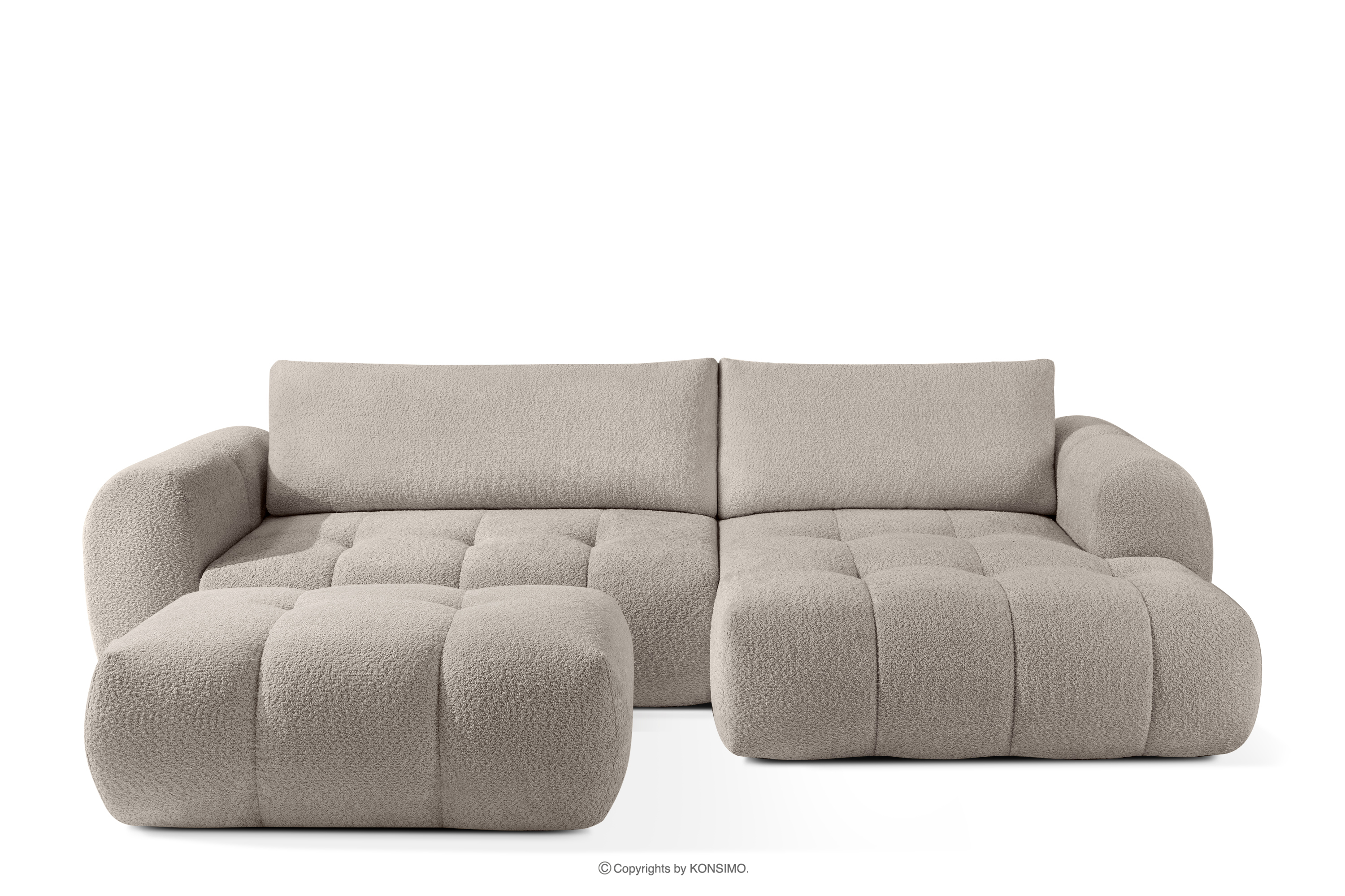 LIRA Objav celú kolekciu Pravá rohová pohovka a puf z látky boucle sivej farby- farba sivá