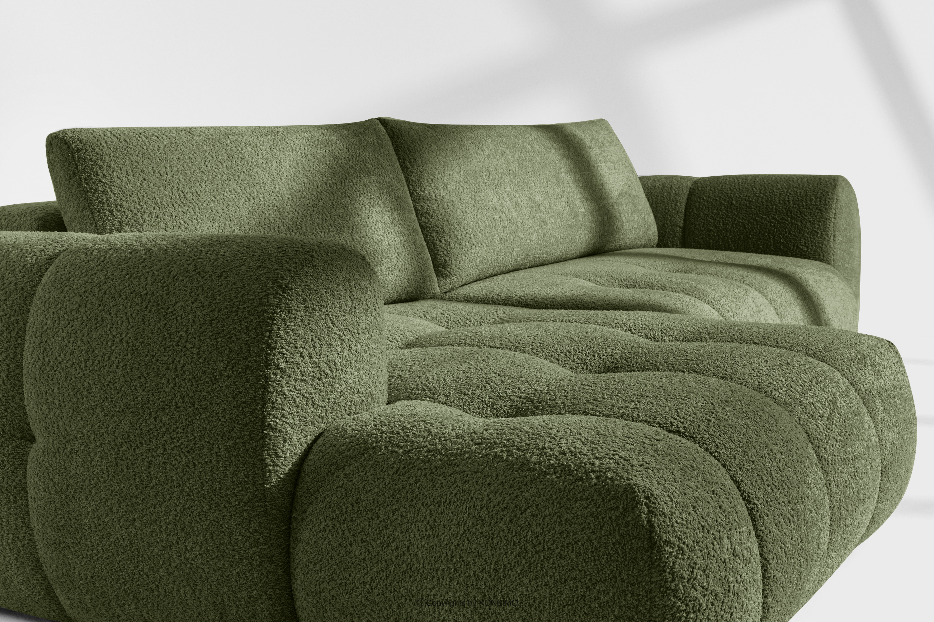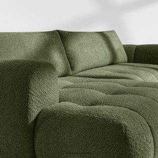 Lavá rohová pohovka a puf z látky boucle olivová dodá interiéru luxusný a útulný charakter. Unikátna štruktúra tkaniny vytvára jemné vzory, ktoré krásne ladia s prirodzeným svetlom a dodávajú nábytku hĺbku a charakter. Čalúnená luxusnou látkou boucle, táto pohovka nadchne svojou mäkkosťou a príjemným povrchom na dotyk. Inovatívny pružinový systém DL zaisťuje výnimočnú odolnosť a pružnosť sedadla.