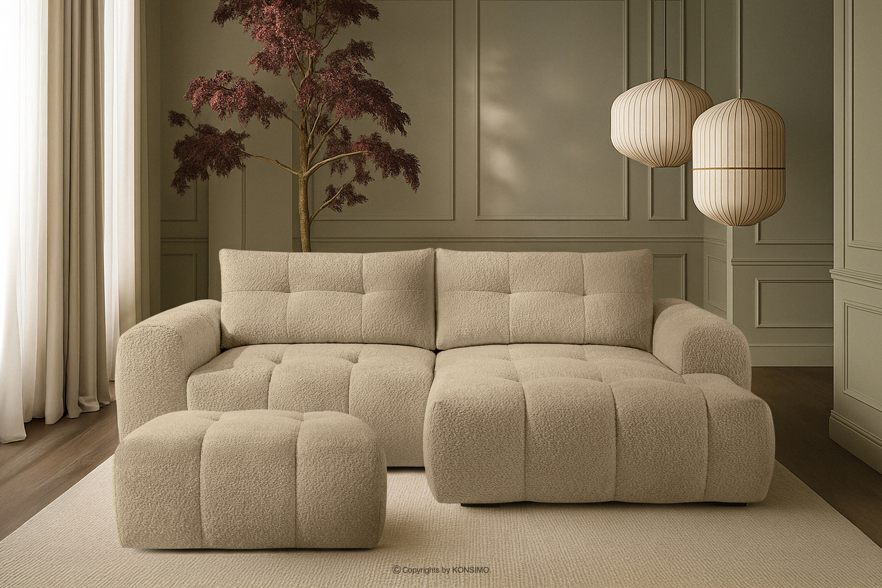 Prošívaný puf v japandi stylu světle béžový spája v sebe strohú eleganciu japonského dizajnu s útulným minimalizmom škandinávskych interiérov. Čalúnená výnimočnou látkou boucle, ktorá nielenže nadchne svojou štruktúrou a mäkkosťou, ale dodáva nábytku luxusný charakter, kolekcia RAVIA vnáša do každej miestnosti pocit pokoja a harmónie. Jemné, nerovnomerné spleteniny boucle vytvárajú na povrchu nábytku jemné vzory, ktoré krásne odrážajú svetlo, zdôrazňujú hĺbku farieb a dodávajú nábytku jedinečný, remeselný vzhľad.