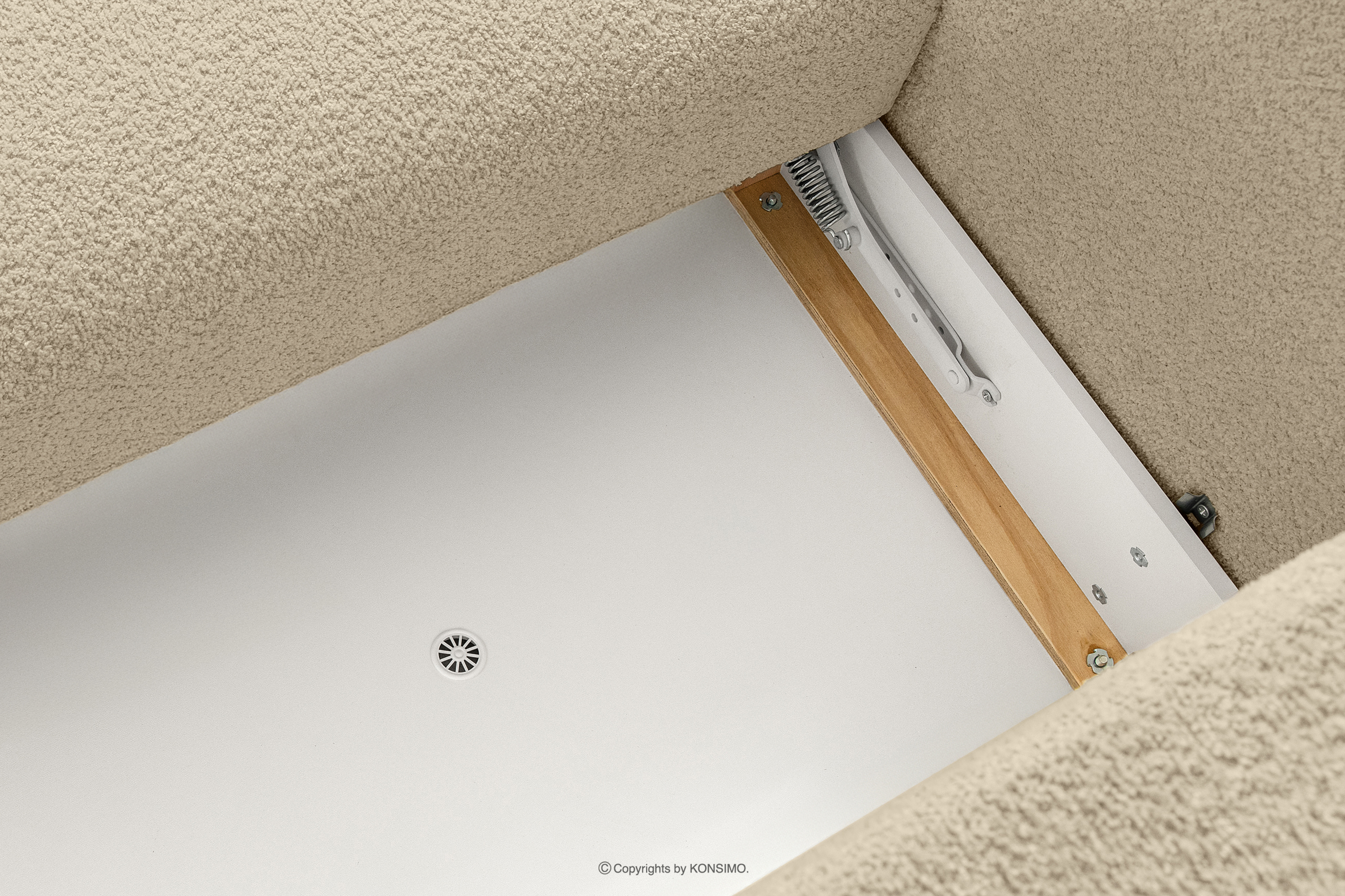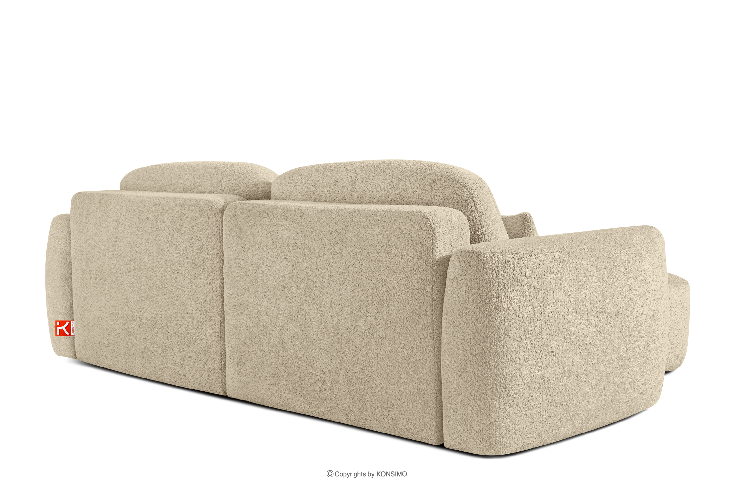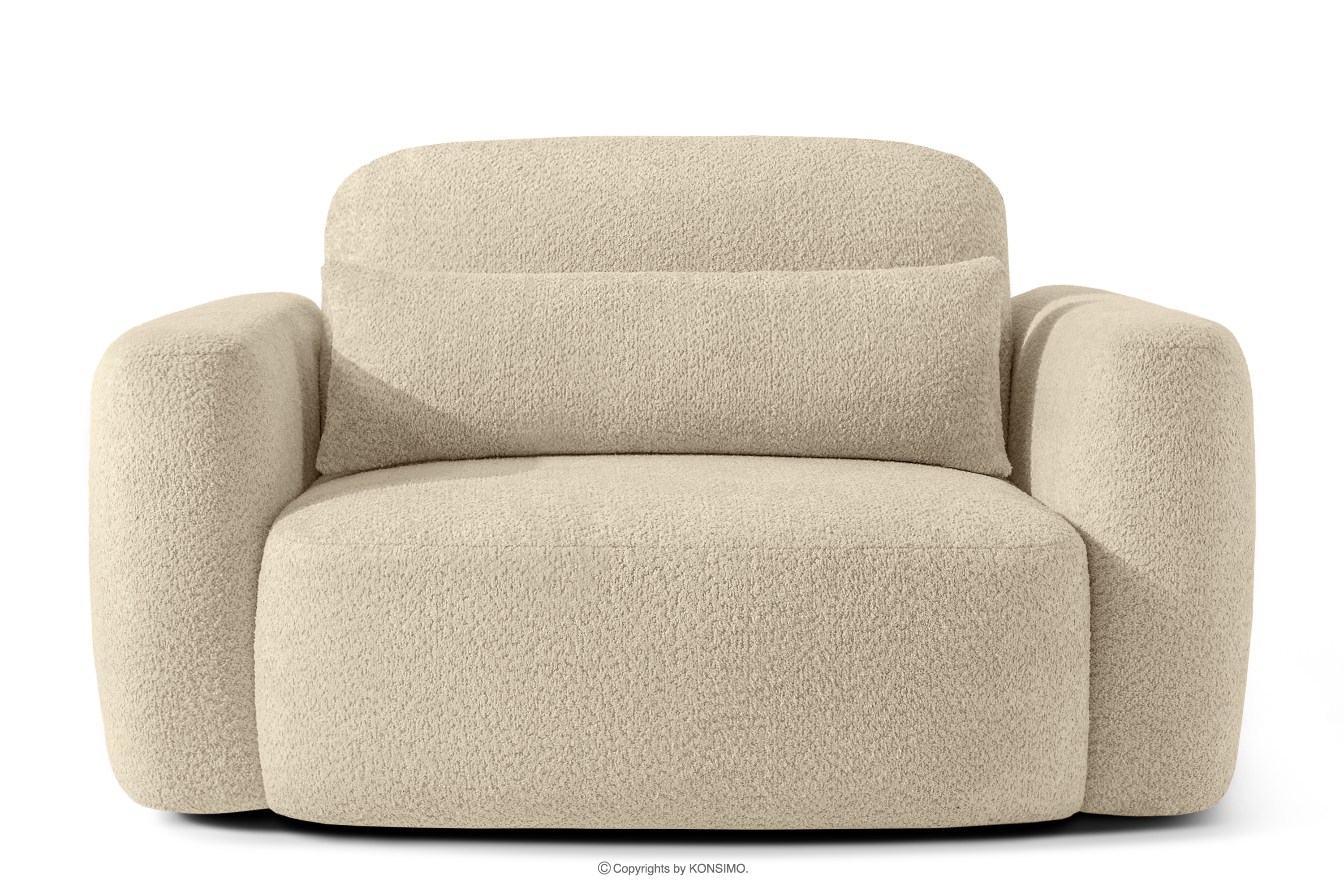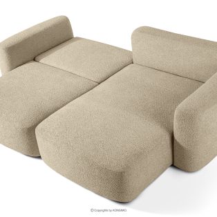 Pravá rohová pohovka a kreslo zo svetlo béžovej bouclé látky prináša revolúciu v poňatí relaxácie. Jeho srdcom je inovatívne sedadlo, ktorého jedinečný vypuklý tvar polmesiaca je nielen pútavý, ale predovšetkým poskytuje bezkonkurenčné pohodlie. Vďaka použitiu vlnitých pružín typu B a vysokokvalitnej peny HR30 je sedadlo stredne tvrdé a zároveň mimoriadne pružné a mäkké.