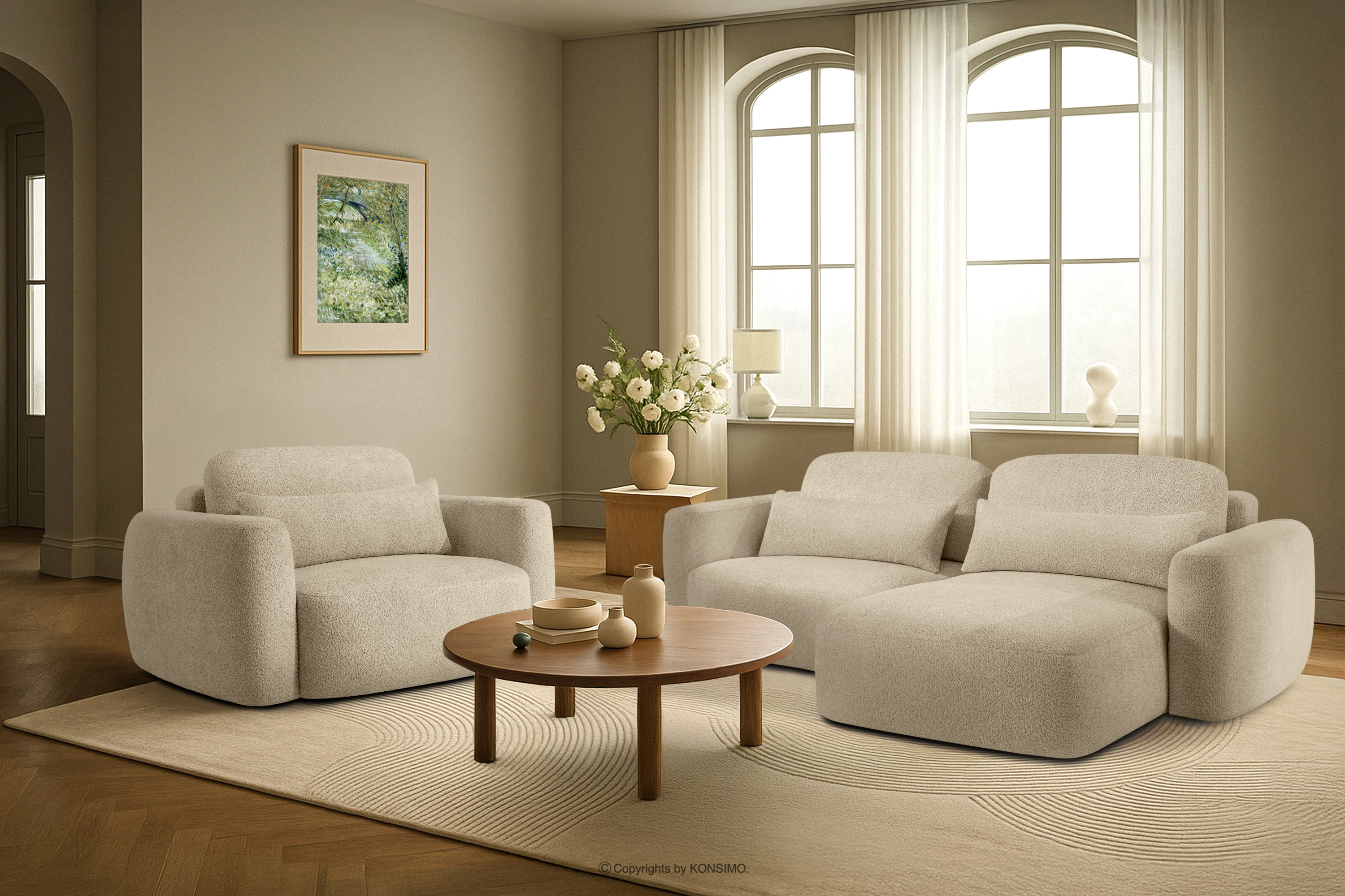 ELOSA Objav celú kolekciu Pravá rohová pohovka a kreslo zo svetlo béžovej bouclé látky- farba světle béžová