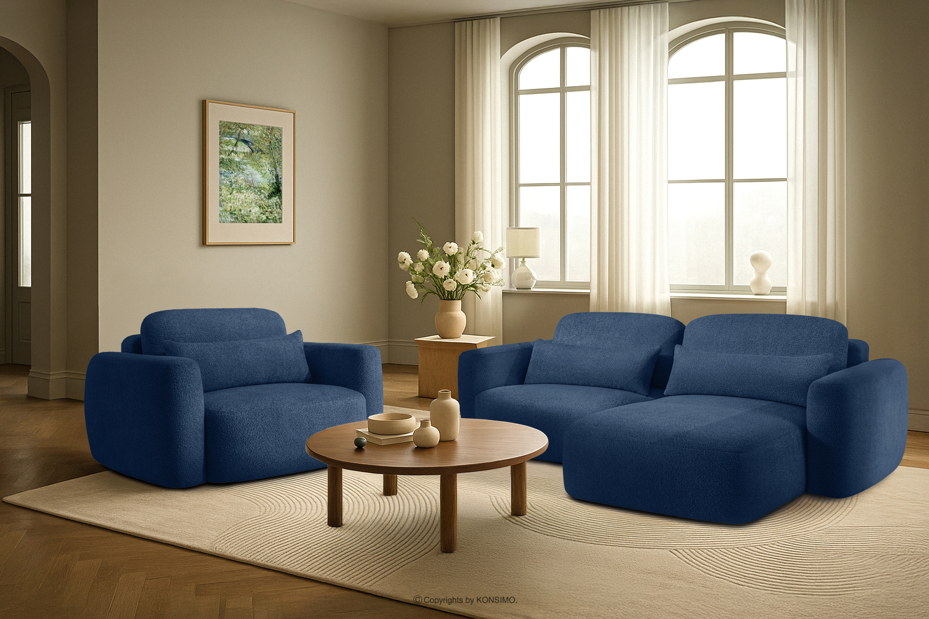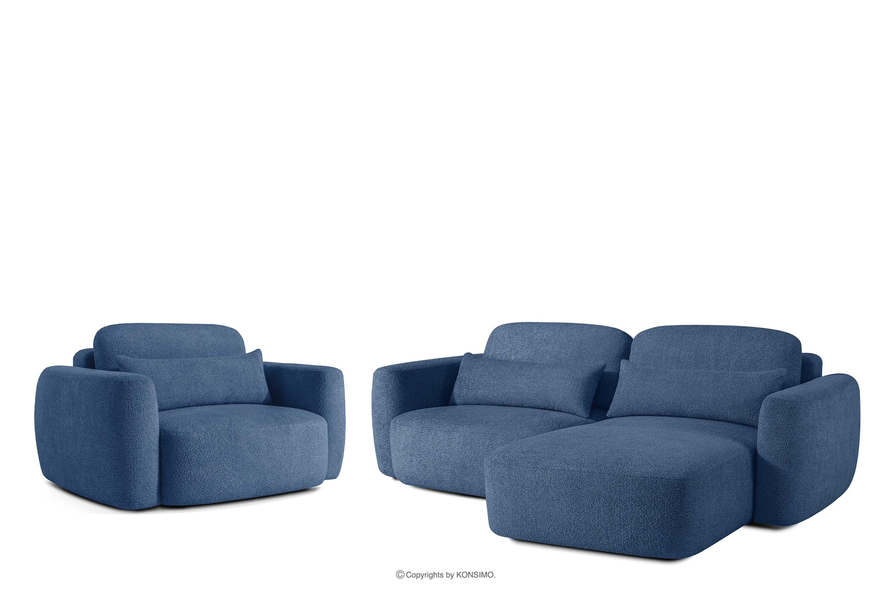 ELOSA Pravá rohová pohovka a kreslo v japonskom štýle tmavomodrá bouclé látka
