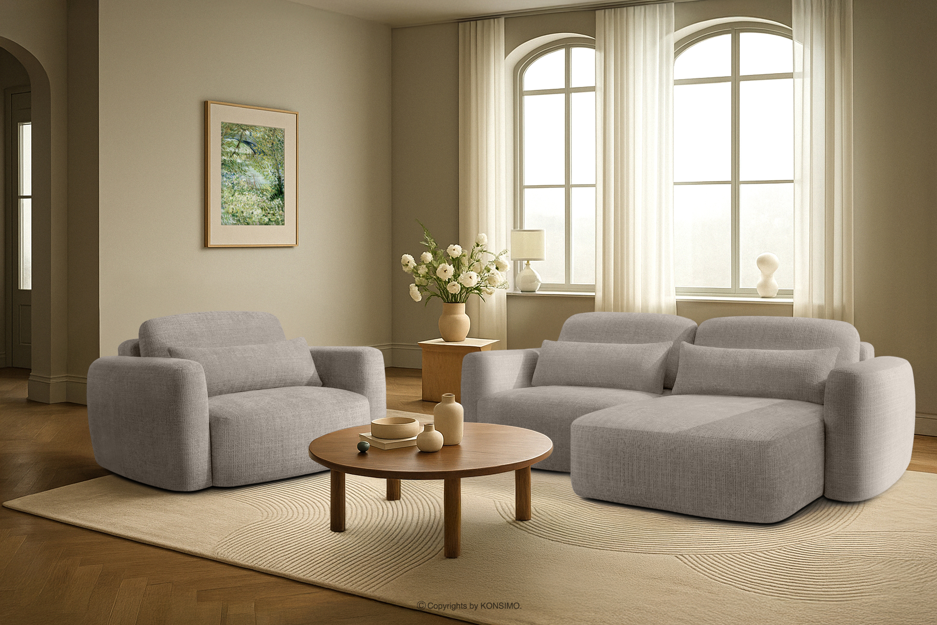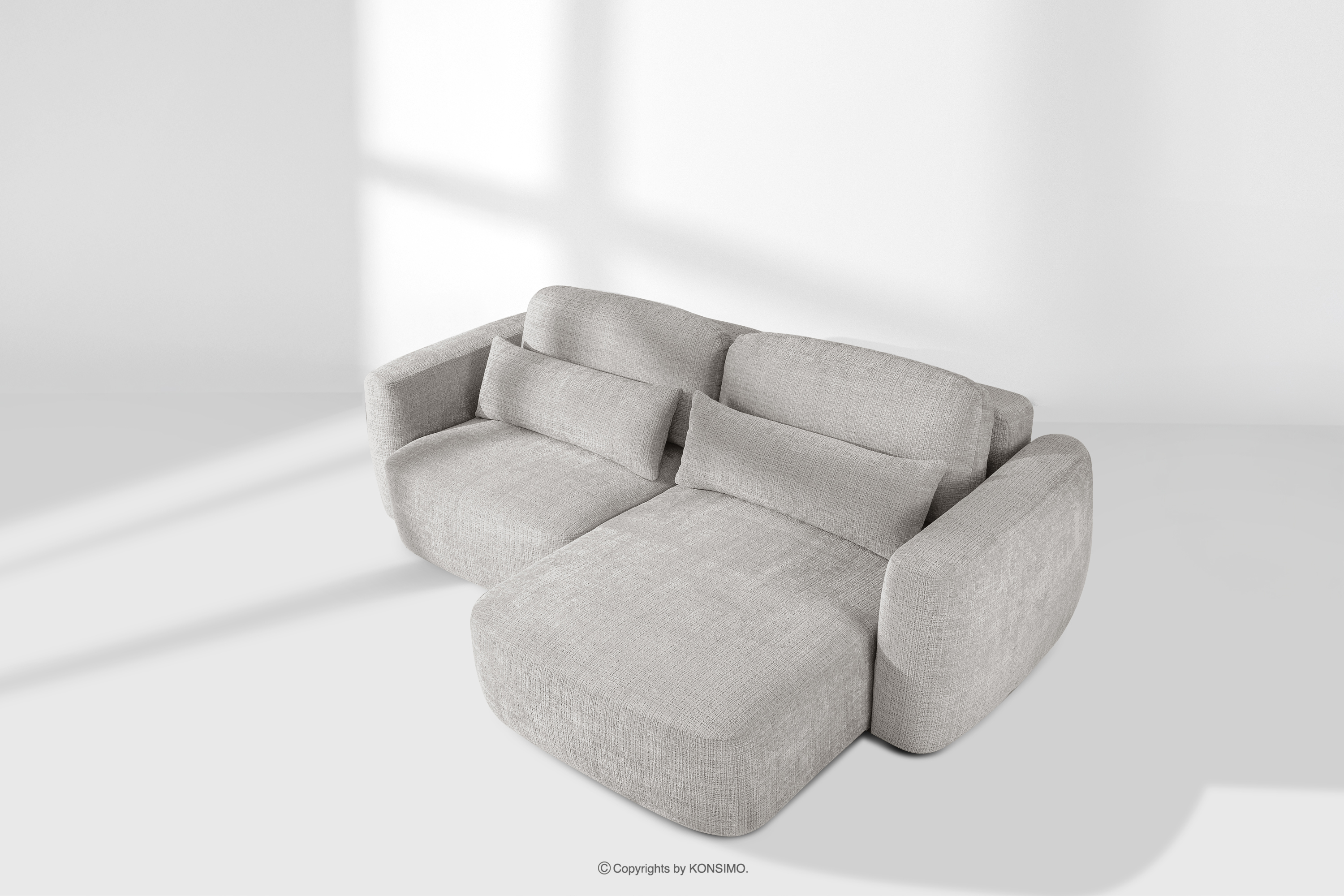 ELOSA Objav celú kolekciu Rohová pohovka Japandi zo svetlosivej šenilovej látky- farba světle šedá