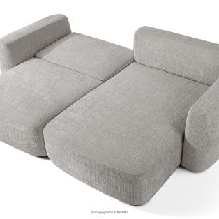 Rohová pohovka Japandi zo svetlosivej šenilovej látky prináša revolúciu v poňatí relaxácie. Jeho srdcom je inovatívne sedadlo, ktorého jedinečný vypuklý tvar polmesiaca je nielen pútavý, ale predovšetkým poskytuje bezkonkurenčné pohodlie. Vďaka použitiu vlnitých pružín typu B a vysokokvalitnej peny HR30 je sedadlo stredne tvrdé a zároveň mimoriadne pružné a mäkké. Táto kombinácia zaručuje dokonalé prispôsobenie, minimalizuje tlakové body a zabezpečuje relaxáciu na najvyššej úrovni.