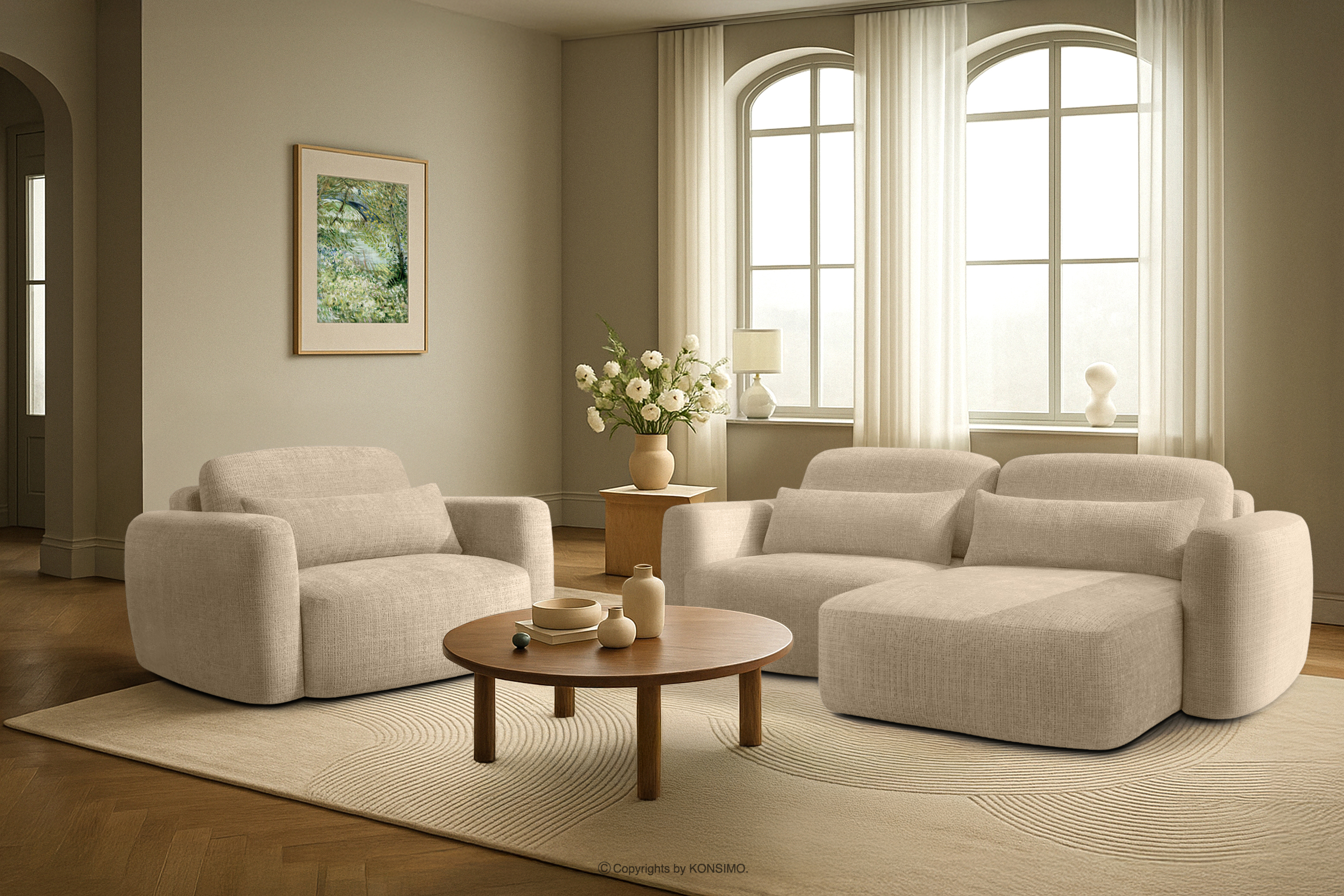 produktu Pravá rohová pohovka a kreslo v štýle Japandi krémová ženilka