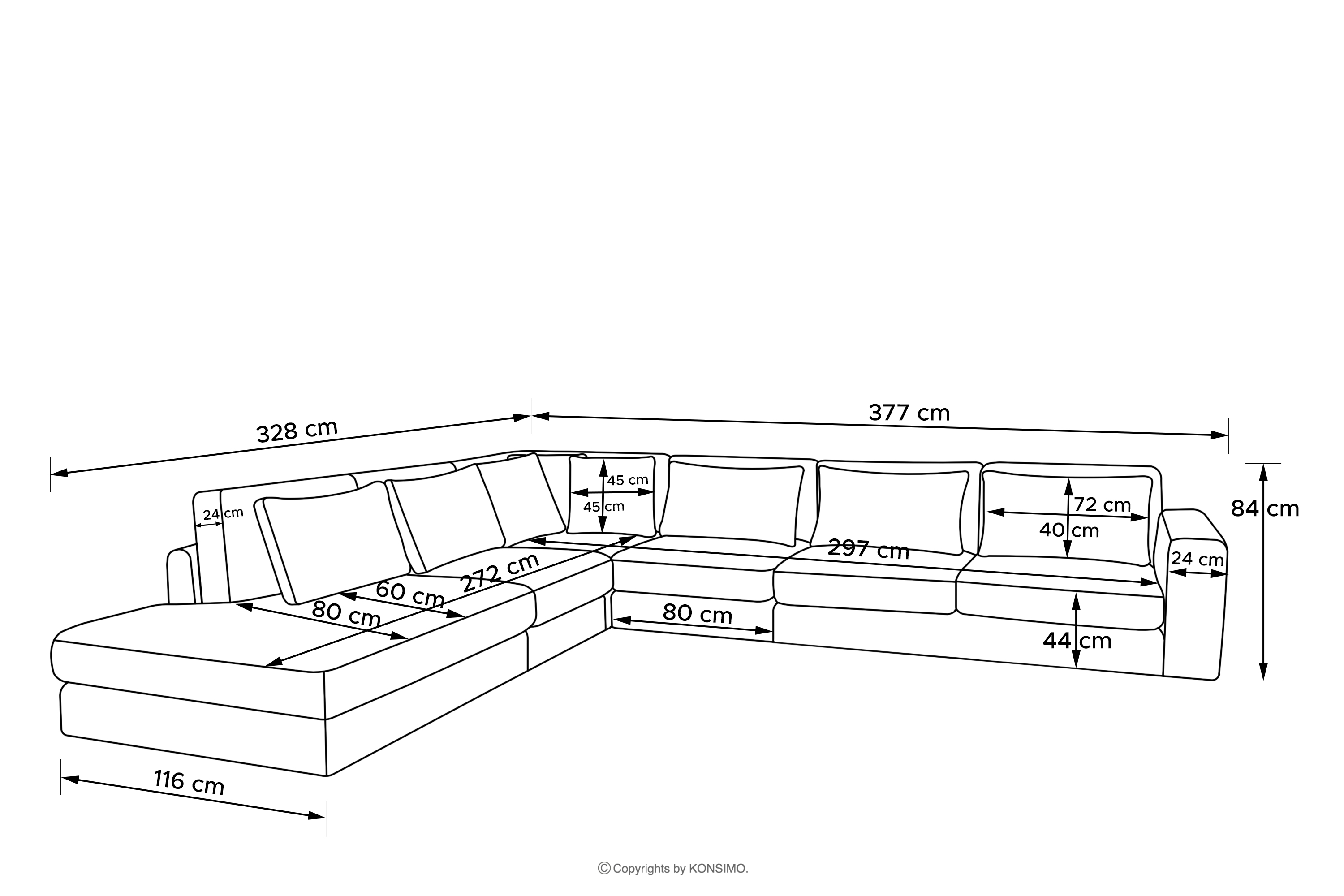 - Vankúše: 3x malý vankúš, 5x dekoratívny obdĺžnikový vankúš, 7x vankúš na operadlo, náplň zo silikónových guličiek a penových granúl