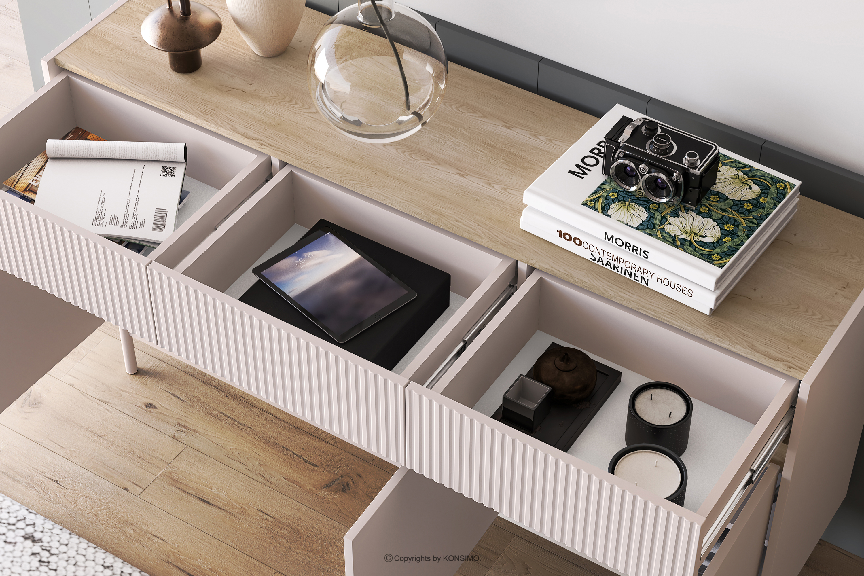 Vďaka svojmu univerzálnemu dizajnu môže tento kus nábytku slúžiť ako ústredný kus nábytku v spálni alebo obývačke a zároveň ponúka praktické riešenia úložného priestoru.