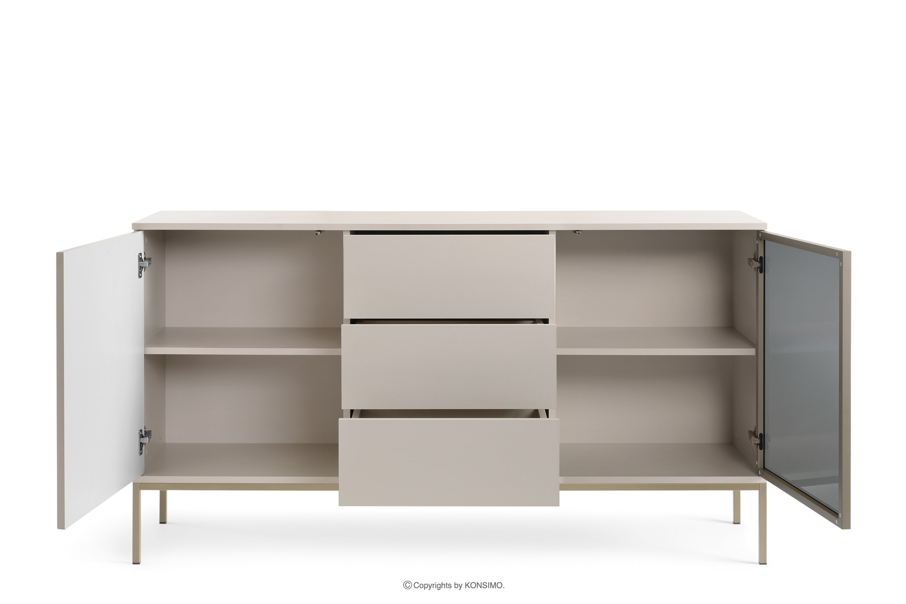 Krémová široká komoda so sklenenými dvierkami a lamelami vyrobená z vysoko kvalitnej laminovanej dosky s hrúbkou 16 mm, zaručuje odolnosť a odolnosť voči každodennému používaniu. Čelné strany z frézovaného MDF s hrúbkou 18 mm dodávajú eleganciu a hĺbku, vytvárajúc jedinečný trojrozmerný efekt. Sklenené prvky z tvrdeného čierneho skla antisol s hrúbkou 4 mm, orámované hliníkovými rámikmi, zdôrazňujú estetiku nábytku.