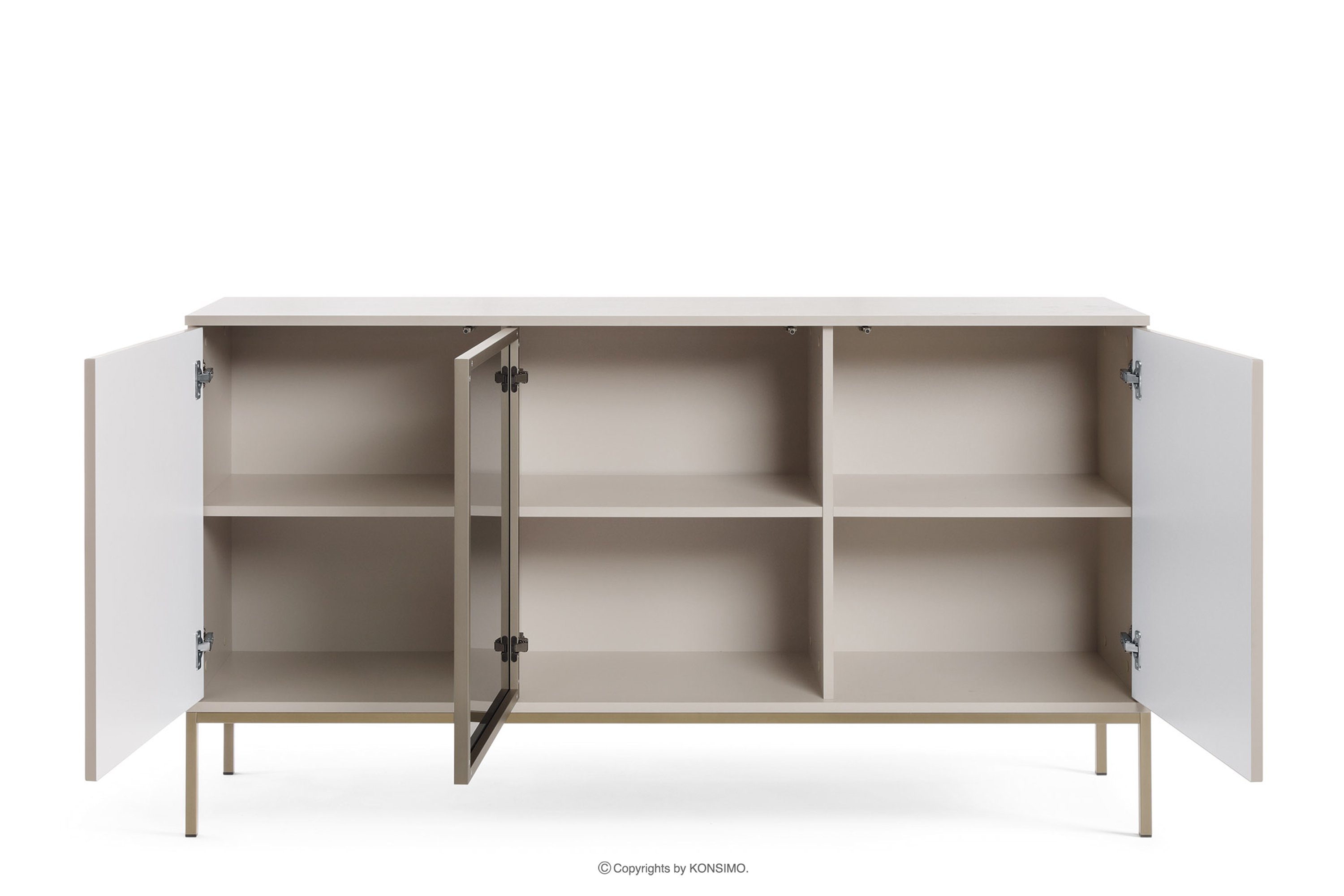 Krémová veľká komoda so sklenenými dvierkami a lamelami vyrobená z vysoko kvalitnej laminovanej dosky s hrúbkou 16 mm, zaručuje odolnosť a odolnosť voči každodennému používaniu. Čelné strany z frézovaného MDF s hrúbkou 18 mm dodávajú eleganciu a hĺbku, vytvárajúc jedinečný trojrozmerný efekt. Sklenené prvky z tvrdeného čierneho skla antisol s hrúbkou 4 mm, orámované hliníkovými rámikmi, zdôrazňujú estetiku nábytku.