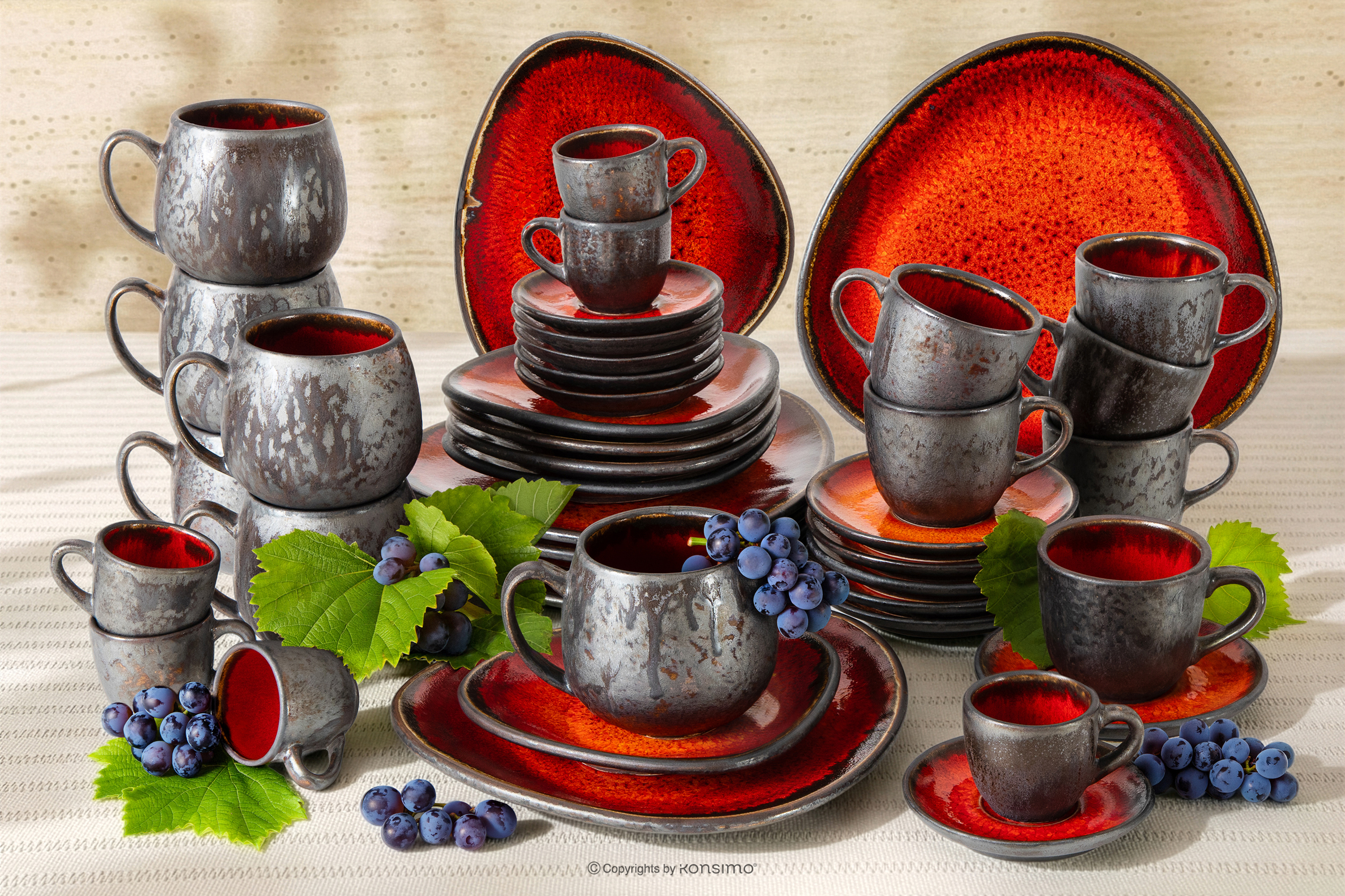Súprava na kávu a raňajky pre 6 osôb (42 ks) červená – esencia surovej krásy a modernej elegancie, zakomponovaná do funkčnej keramiky. Vytvorená pre tých, ktorí oceňujú autenticitu a originálny dizajn, PRIMA je poctou štýlu Loft, kde kľúčovú úlohu zohrávajú priestor, svetlo a prírodné materiály. Dominantná svetlá, smotanová béžová farba je farbou zeme, piesku a prírodného kameňa.