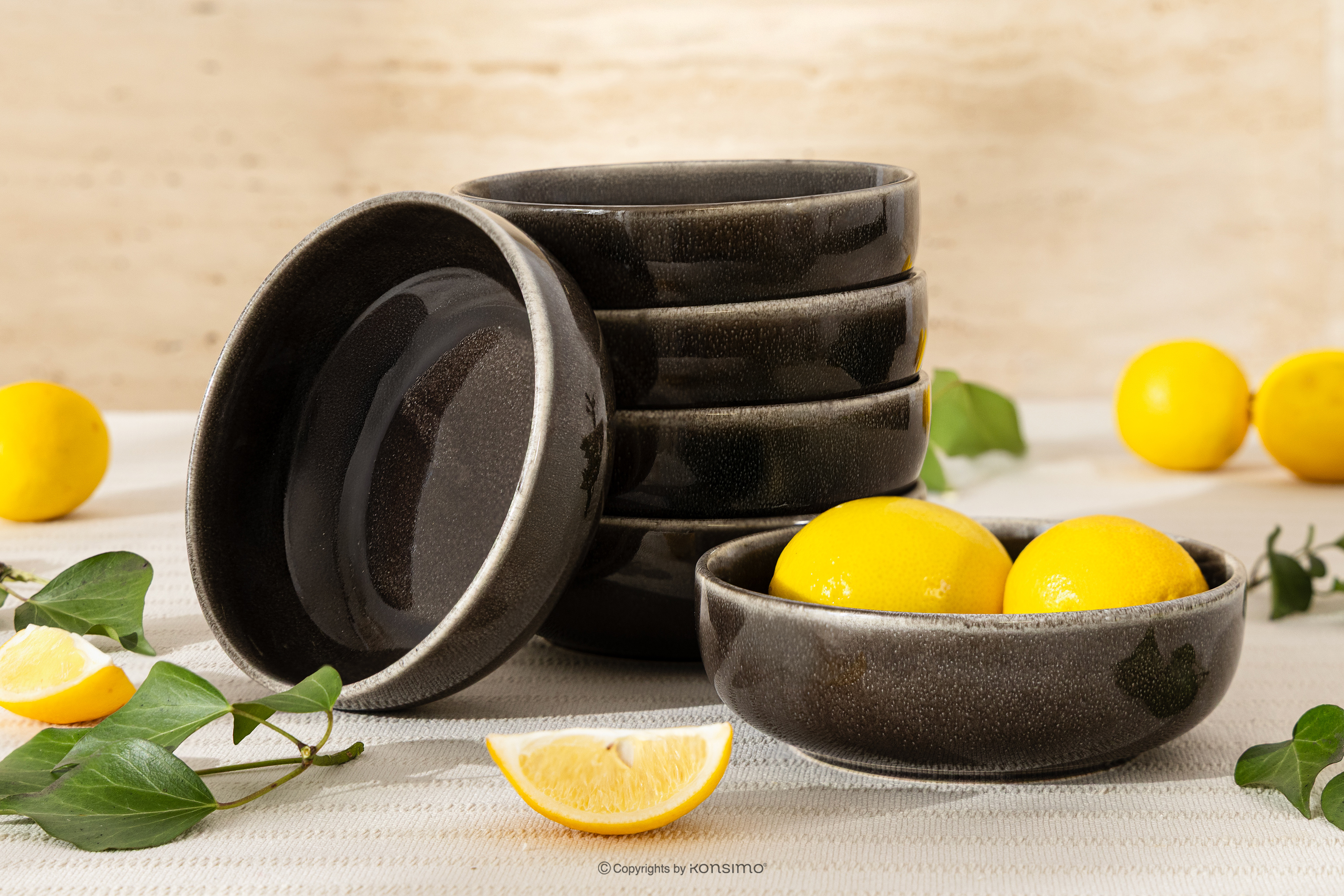 Keramická miska v rustikálnom štýle hnedá/sivá/béžová 6 ks. navrhnuté s ohľadom na odolnosť, pohodlie a dlhotrvajúcu krásu. Každý kus je vytvorený pomocou procesu, ktorý kombinuje tradičné remeselné zručnosti s modernými spracovateľskými technikami, vďaka čomu je riad vysoko odolný voči každodennému používaniu. Keramika je pevná, vďaka čomu je ideálna ako na elegantné stolovanie, tak aj na každodenné rodinné jedlá.