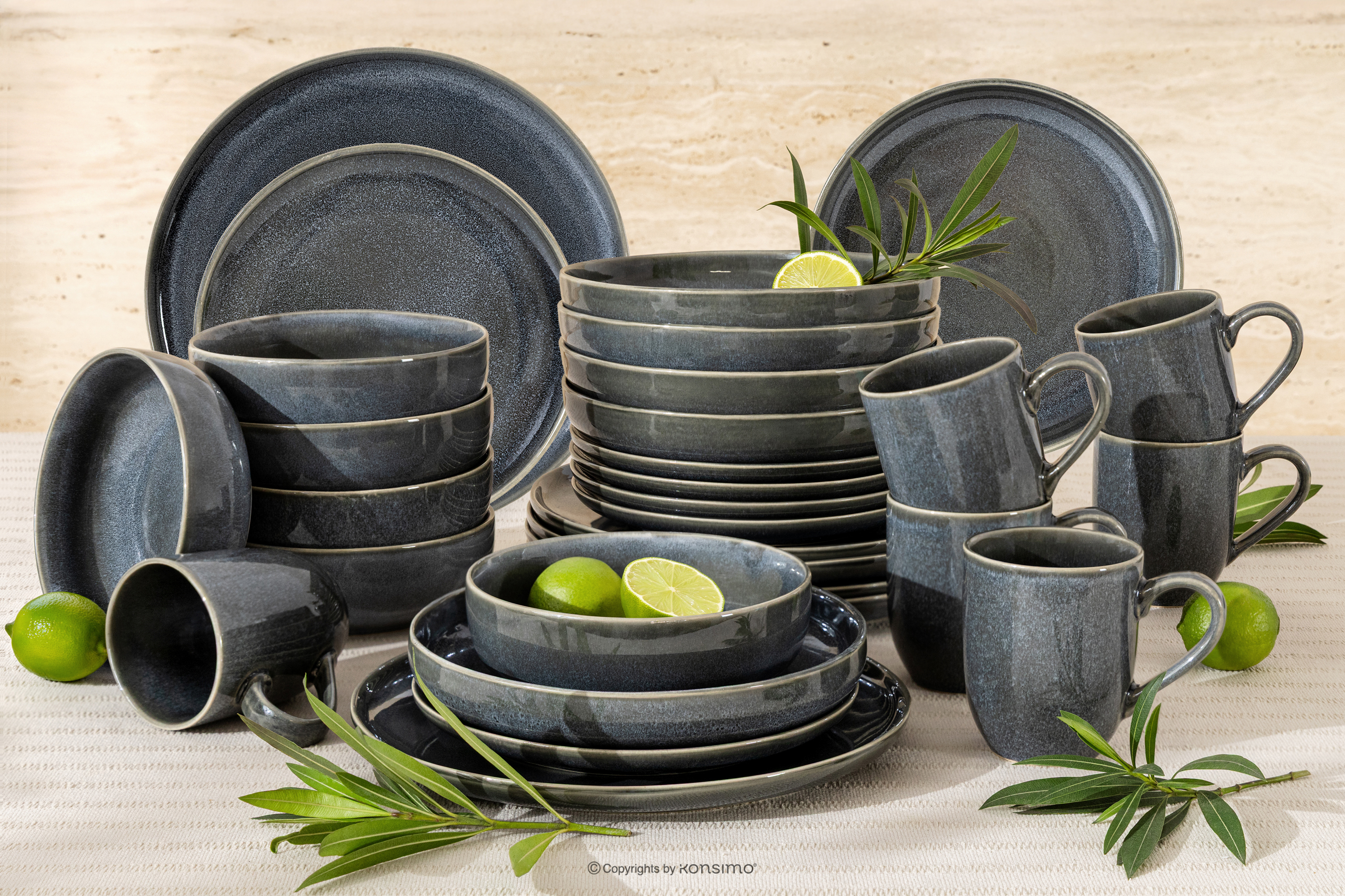 Jedálenský súprava pre 6 osôb (30 ks) z keramiky v rustikálnom štýle modrá/sivá/béžová navrhnuté s ohľadom na odolnosť, pohodlie a dlhotrvajúcu krásu. Každý kus je vytvorený pomocou procesu, ktorý kombinuje tradičné remeselné zručnosti s modernými spracovateľskými technikami, vďaka čomu je riad vysoko odolný voči každodennému používaniu. Keramika je pevná, vďaka čomu je ideálna ako na elegantné stolovanie, tak aj na každodenné rodinné jedlá.