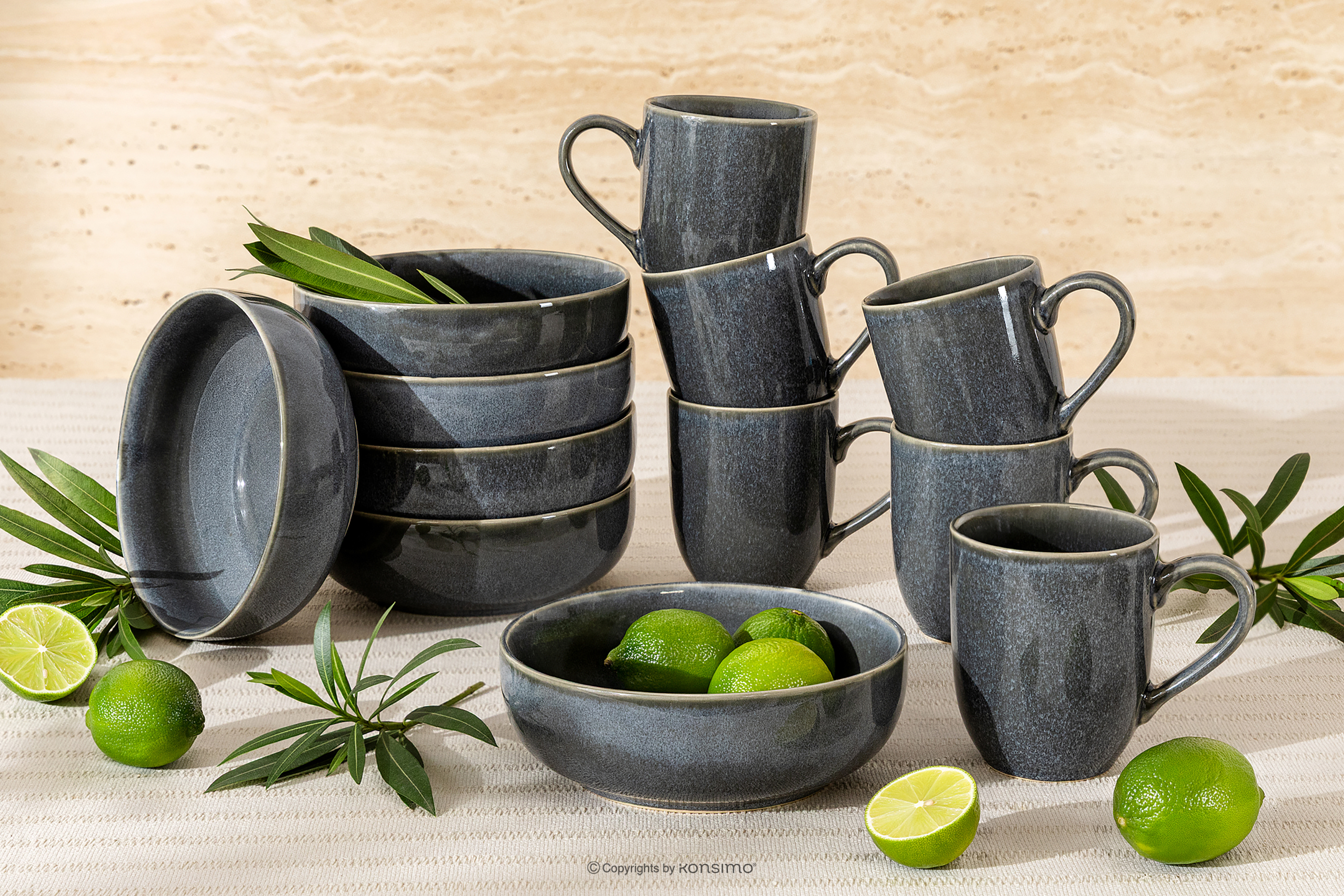 Raňajková súprava pre 6 osôb (12 ks) z keramiky v rustikálnom štýle v modrá/sivá/béžová farbe navrhnuté s ohľadom na odolnosť, pohodlie a dlhotrvajúcu krásu. Každý kus je vytvorený pomocou procesu, ktorý kombinuje tradičné remeselné zručnosti s modernými spracovateľskými technikami, vďaka čomu je riad vysoko odolný voči každodennému používaniu. Keramika je pevná, vďaka čomu je ideálna ako na elegantné stolovanie, tak aj na každodenné rodinné jedlá.